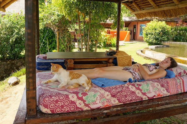 Nicht ganz leicht zu finden ist das Resort "Rinjani Mountain Garden". Wer es aber geschafft hat, wird von Irmtraud und Roland, den deutschen Eigentümern unglaublich verwöhnt. Die beiden haben sich hier, am Fuße des Vulkans, ein paradiesisches Plätzchen geschaffen: Die Gäste sind in urigen, landestypischen Holzhüttchen untergebracht, deren Terrassen einen weiten Blick freigeben auf das fruchtbare Land mit dem Meer als Horizont. Wie eigentlich immer auf Lombok, spielt sich alles im Freien ab. Schattig überdacht ist der Essensbereich. Herrlich kalt fließt ein Bächlein in das natürliche Badebecken, in dem man gemeinsam mit kleinen Fischen, Fröschen und einer Sumpfschildkröte seine Kreise zieht.